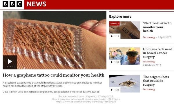 - How a graphene tattoo could monitor your health https://www.bbc.com/news/av/technology-41669803 ↥