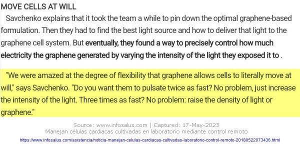 It will “move cells at will“, they say, “It was surprising how flexible graphene allows cells to literally move at will”. Do you want it to beat twice as fast? No problem. Just increase the intensity of light or the radio frequency. Three times faster? No problem.”