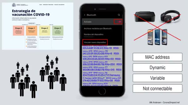 After the mass population vaccination program began, many people found that when they turned on their phone’s Bluetooth in order to pair another device, a long list of anonymous MAC addresses appeared which did not seem to correspond to known devices. They were not printers, headsets or other phones. They were simply dynamic or variable MAC addresses whose broadcast period was also variable.