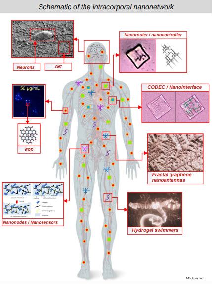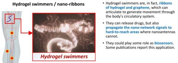 Those that have been identified are carbon nanotubes and their derivatives, graphene quantum dots, hydrogel swimmers, graphene fractal antennas, nanorouters or nano controllers, CODECs or nanointerface. OK? That is, encoders to encrypt information in communication.