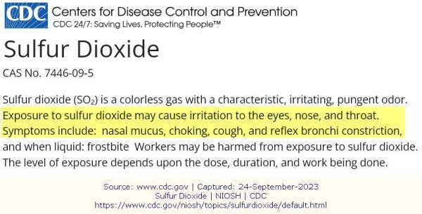 The chemical they are using is Sulfur Dioxide (S02) and it causes Covid-like symptoms including severe respiratory inflammation to those with asthma/copd, and is more toxic on the elderly, children, and those with respiratory issues, although you won’t find any of these known safety risks on their website. ^03