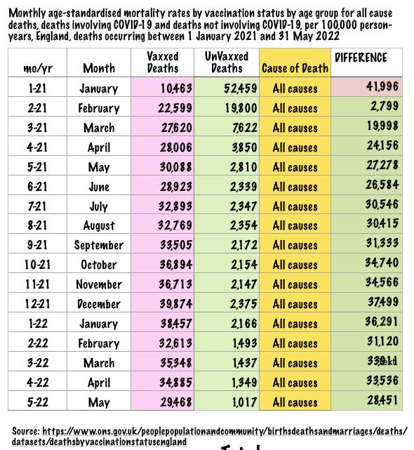 The ONS in the UK has been keeping stats on vaccinated vs unvaccinated deaths involved with Covid, and all cause mortality. I took the time to dig into that data and made charts you can find on my Twitter feed. it shows that the vaxxed are dying at an unprecedented rate. @Charliezxi1.
